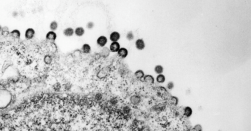 B) Electron microscopy of HIV budding an infected CD4 T-cell, a type of immune cell responsible of coordinating the immune system.
