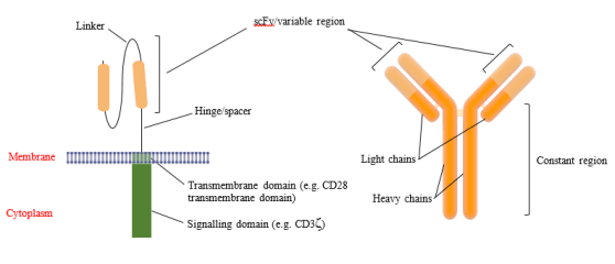 The field of study focused on answering these questions is known as immunotherapy, and one of the most promising immunotherapies to date is the Chimeric Antigen Receptor (CAR) T cell therapy. This therapy aims to modify T cells (cells in the immune system responsible of ‘coordinating’ the immune response) with CAR receptors – hybrids between receptors already present on these cells and antibodies specific to a protein of interest (Figure 2). This would allow a customised immune response to any of the cancer proteins, giving rise to a ‘living drug’.