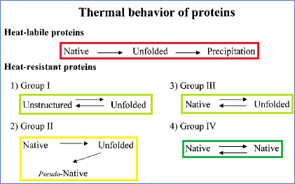 Figure 2: Most of the proteins are heat-labile proteins, which, at high temperatures, unfold (lose their structure) and precipitate (thus, become insoluble). However, heat-resistant/heat-stable proteins do not lose their solubility at high temperatures and are divided into 4 groups. Only Group IV contains heat-stable proteins from thermophiles (more precisely from hyperthermophiles). These proteins retain their original (native) structures at high temperatures. On the other hand, Groups I, II, & III contain heat-stable proteins from other organisms (such as mesophiles and eukaryotes living at moderate temperatures). These proteins are actually unfolded at high temperatures, but they have the full (Groups I & III) or partial (Group II) abilities to return to their original/soluble structures. Adapted from “Thermal Behavior of Proteins: Heat-Resistant Proteins and Their Heat-Induced Secondary Structural Changes,” by T. D. Kim et al., 2000, Biochemistry, 39, p. 14839-14846.