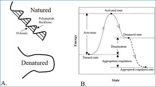 Figure 1: Denaturation and aggregation/coagulation of a protein. (A) During denaturation, hydrogen bonds of the natured (original) state of a protein are broken, and the protein is converted into a denatured (unfolded) state. (B) When activation energy of denaturation is provided, natured state first converts into a high energy denatured state and then loses energy to convert into a low energy aggregated/coagulated state. Adapted from ” Thermal Stability of Proteins,” by X. He andJ. C. Bischof, 2006, Annals of the New York Academy of Sciences, 1066(1), p. 12-33. Copyright 2006 by the John Wiley and Sons. Adapted with permission.