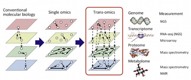 While traditional molecular biology approaches focus on individual genetic mutations and their consequences, omics focuses on relationships between molecules within each layer. The development of technological profiling methods (‘Measurement’ column) for different layers make a systems biology approach using integrated omics (trans-omics) possible. NGS = next generation sequencing, NMR = nuclear magnetic resonance spectroscopy. Figure is taken from Yugi et al. (2016).