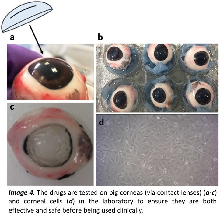 In the lab, I test the drug-loaded contact lenses on pig eyes to ensure that they are both effective and safe before being used clinically. The drugs are loaded via a soaking method overnight before being applied to the eyes (Image 4a) and to mimic real-life conditions the eyes are kept at 37°C (normal body temperature) and artificial tear fluid is applied (Image 4b). The corneas are then removed from the eyes using surgical scissors (Image 4c) and the drug is separated from the cornea chemically using solvent extraction. I can then measure the amount of drug delivered using a separation method called High Performance Light Chromatography (HPLC), which can be used to identify and quantify substances. The drugs are also tested on corneal cells to ensure the delivered concentrations are not toxic (Image 4d).